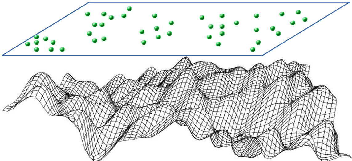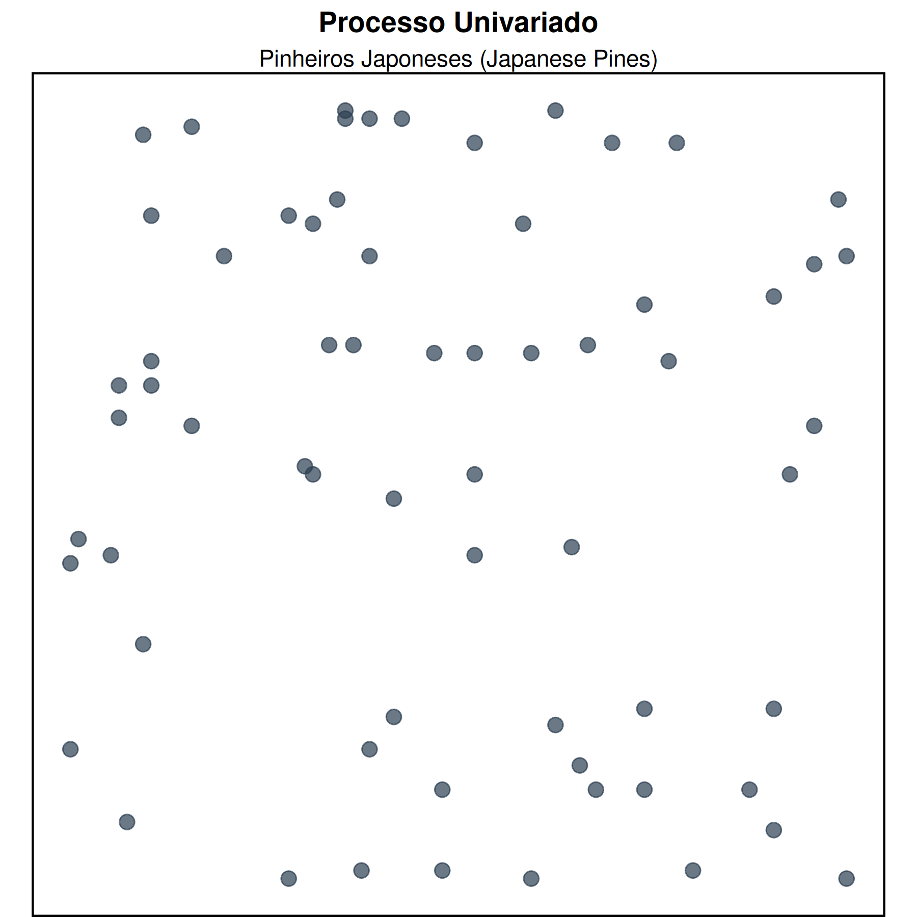 Seja \(S \subseteq \mathbb{R}^{d}\) um espaço métrico, onde \(\mathbb{R}^{d}\) denota um espaço euclidiano \(d\)-dimensional, onde os eventos ocorrem. Um processo pontual espacial em \(B\subseteq \mathbb{R}^{d}\), é uma coleção de variáveis aleatórias {\(n(S): S \subseteq B\)}, onde \(n(S)\) representa o número de eventos ocorridos em um conjunto mensurável \(s\) de \(B\).