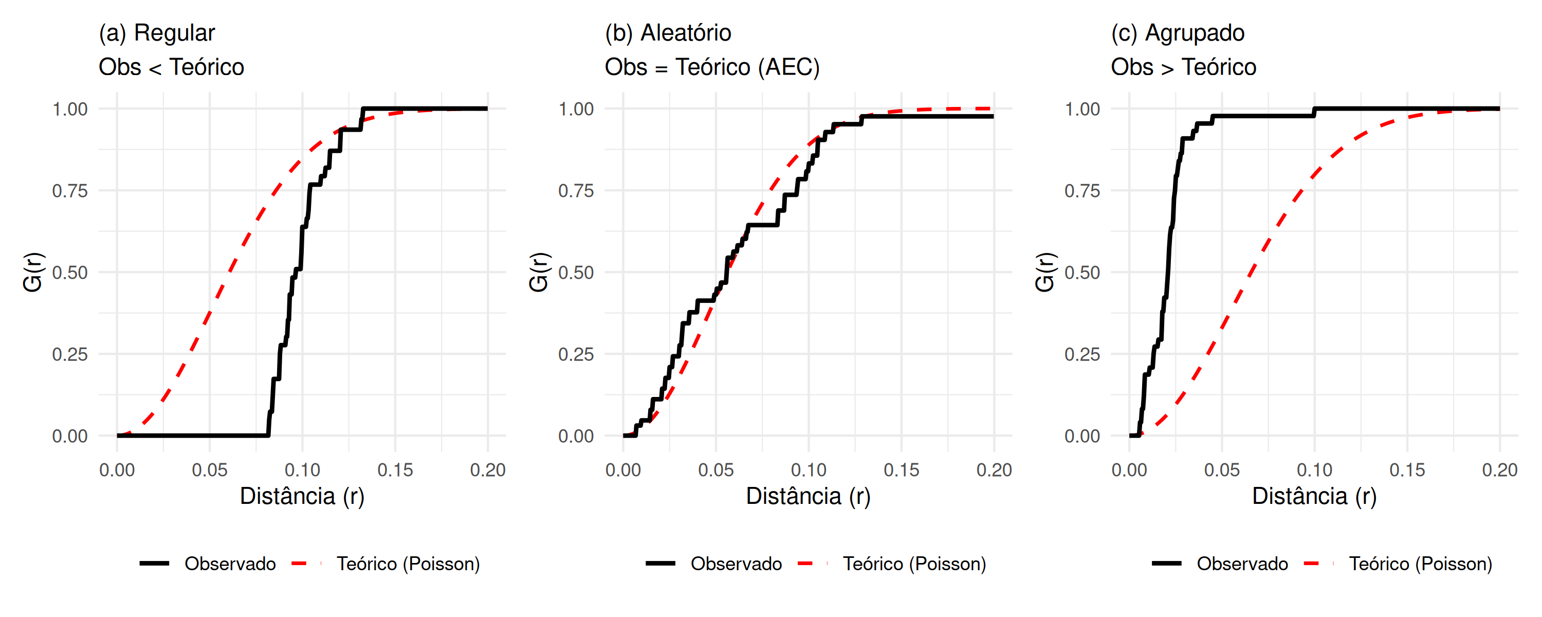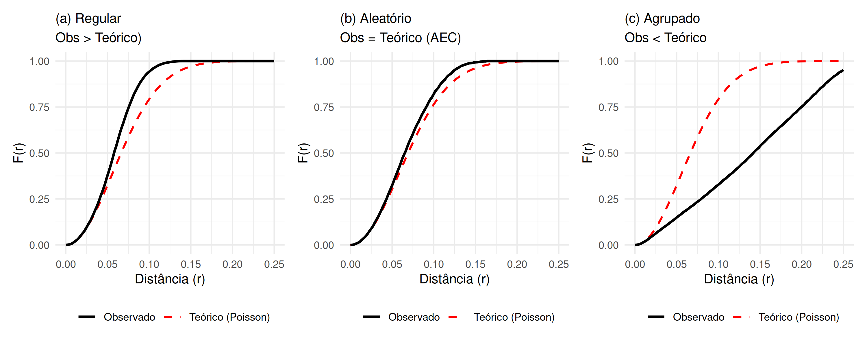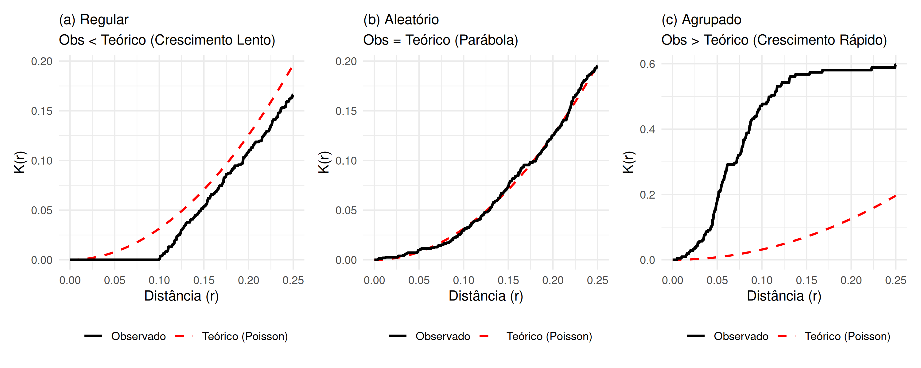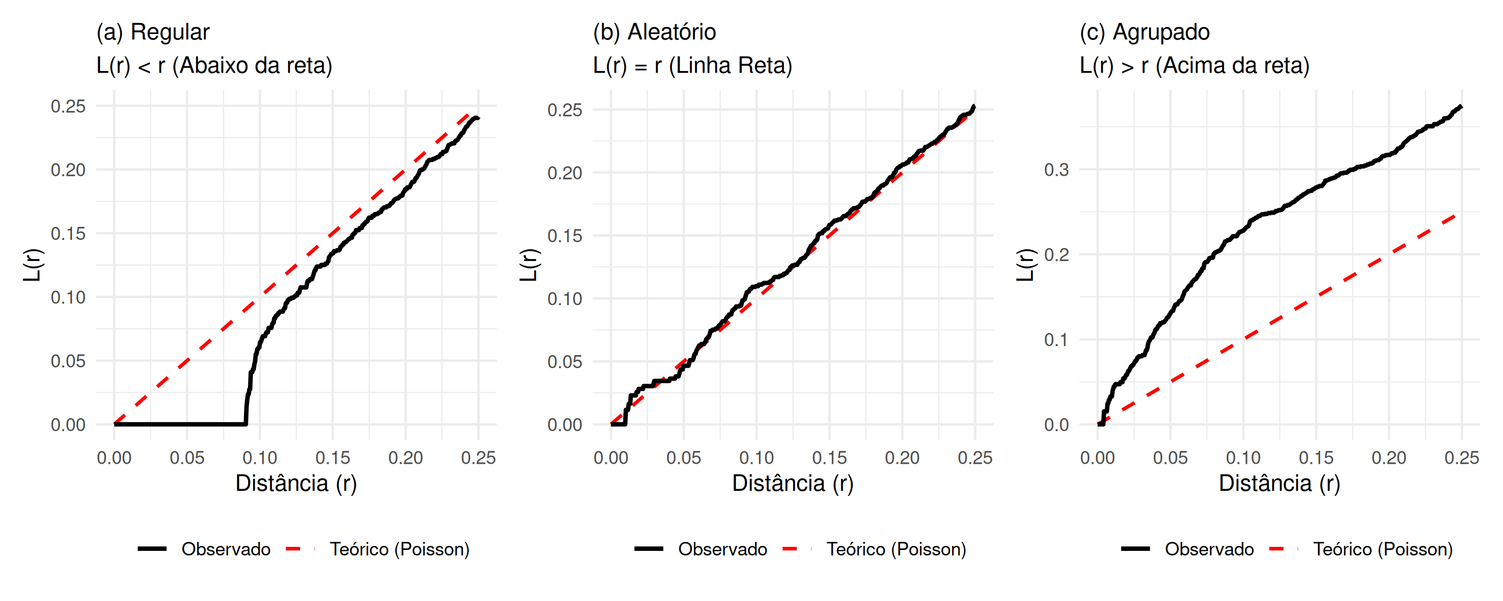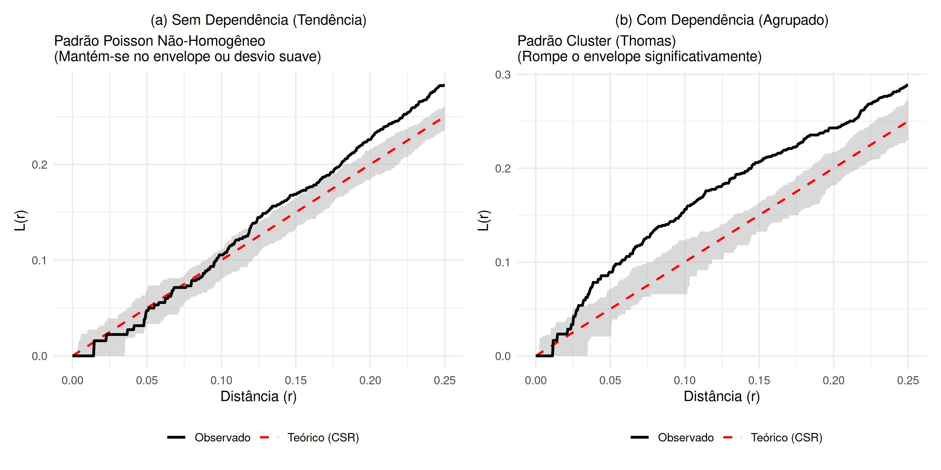 Um processo pontual que segue uma distribuição Poisson e é homogêneo, é denominado processo pontual Poisson homogêneo. Este processo é caracterizado por ser estacionário e isotrópico, razão pela qual é também denominado processo de aleatoriedade espacial completa (não exibe dependência espacial), e se a região \(B\) de estudo é dividida em \(s\) sub-regiões diferentes, a intensidade \(\lambda (s)\) nessas \(s\) sub-regiões, estimada por \(\hat{\lambda} (s)\) será constante (não variará), ou seja, \(\forall s_{i}, s_{i^{'}} \in B: \lambda (s_{i}) \equiv \lambda (s_{i^{'}})\). Isso decorre do fato de que a distribuição Poisson possui média e variância iguais, e sua relação com a distribuição Binomial é demonstrada em Lima (2005) e Mateus (2013). Caso o processo pontual seja Poisson, mas apresente tendência, ele é denominado processo pontual Poisson não homogêneo. Nesse contexto, embora o processo não exiba dependência espacial, a intensidade \(\lambda (s)\) nas \(s\) sub-regiões não é constante, ou seja, \(\exists \, s_{i} \in B: \lambda (s_{i}) \neq \lambda (s_{i^{'}})\) e, o número médio de eventos nessa situação é dado por, \(\mu = \int_{B} \lambda (s)\).