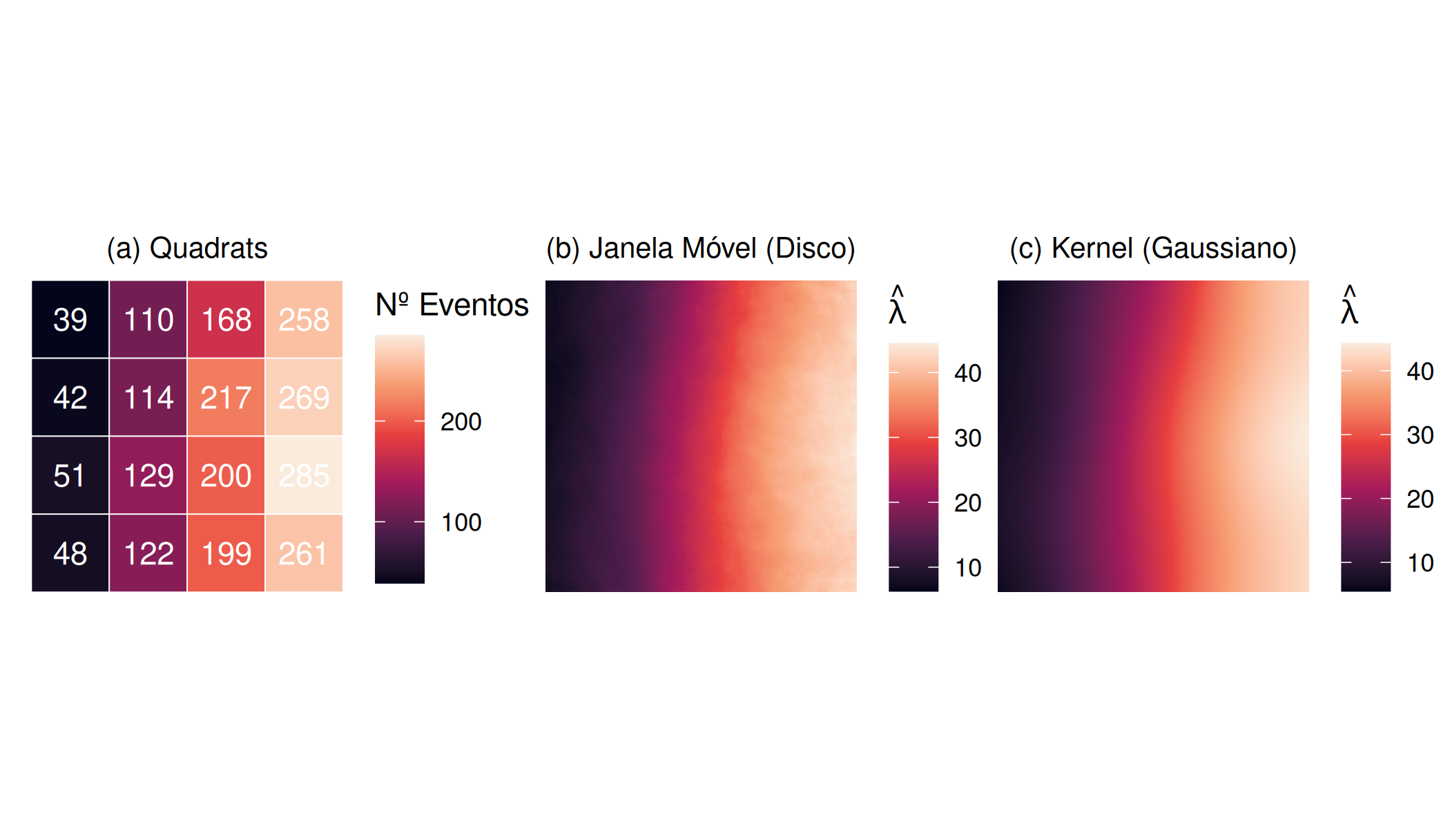 Figura 5.2: Comparação de Estimadores de Intensidade: (a) Quadrats (Não suavizada), (b) Janela Móvel (Disco Uniforme) e (c) Estimativa de Kernel (Gaussiano).