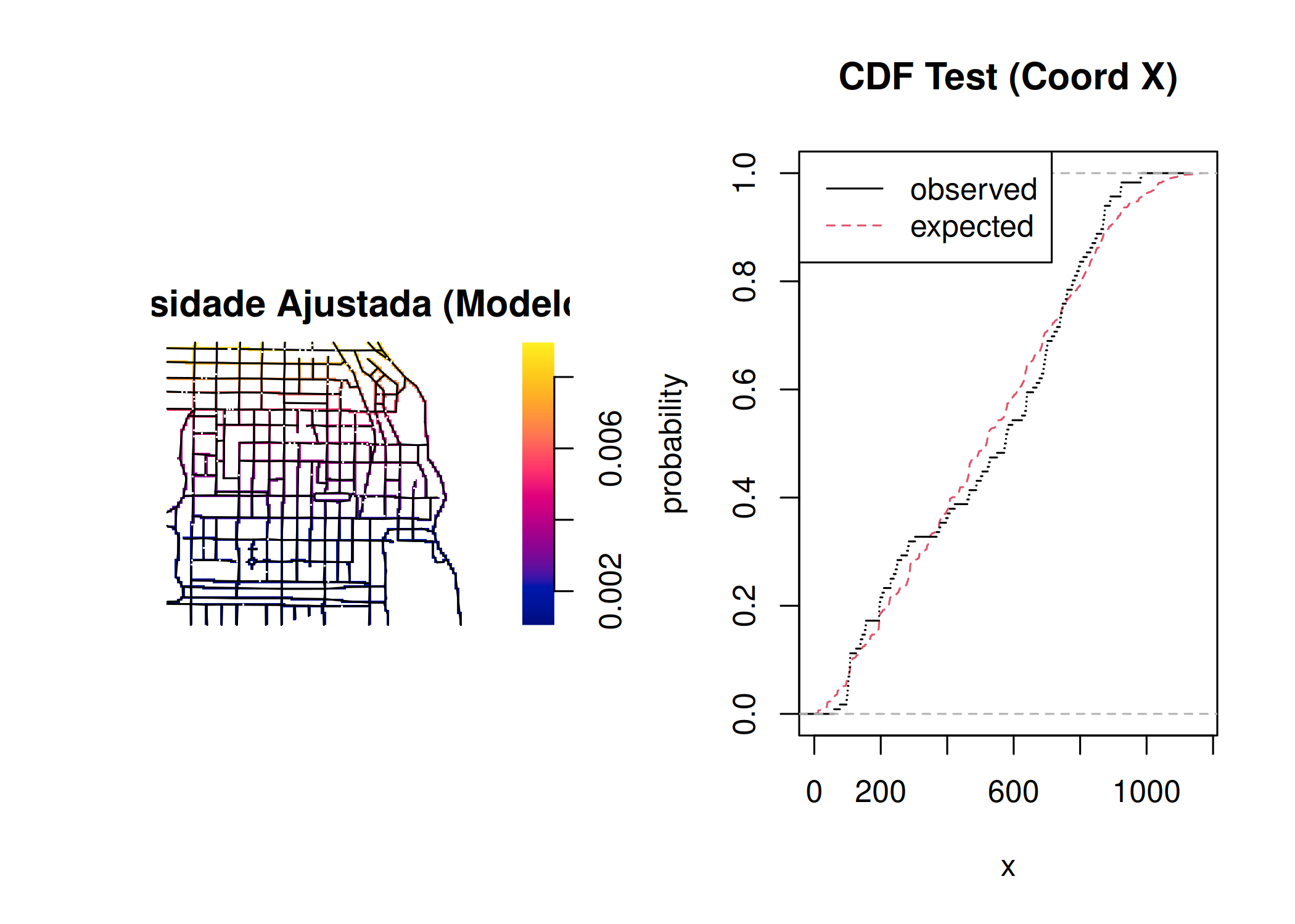 • ppm(..., use.gam=TRUE): Esta é a função de ajuste de modelos de processos pontuais (ppm). Ao ativar use.gam=TRUE, instruímos o spatstat a não usar o algoritmo padrão de regressão linear (glm), mas sim invocar o mgcv::gam para ajustar os coeficientes da intensidade. Isso permite o uso de termos s() (splines penalizados) na fórmula, capturando tendências complexas que uma função linear ou quadrática simples perderia.