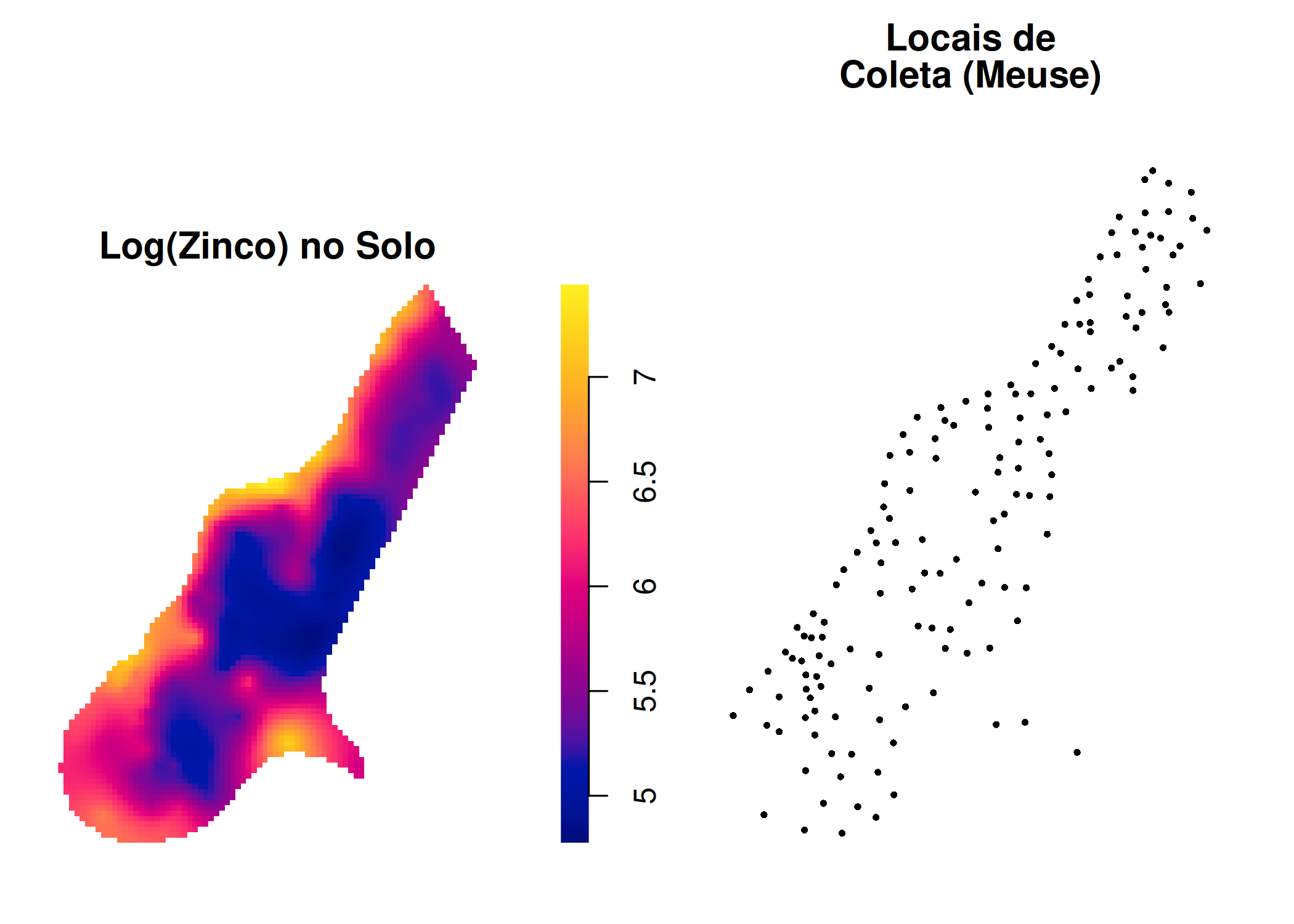 plot(mapa_zinco_im, main = "Log(Zinco) no Solo", box = FALSE)