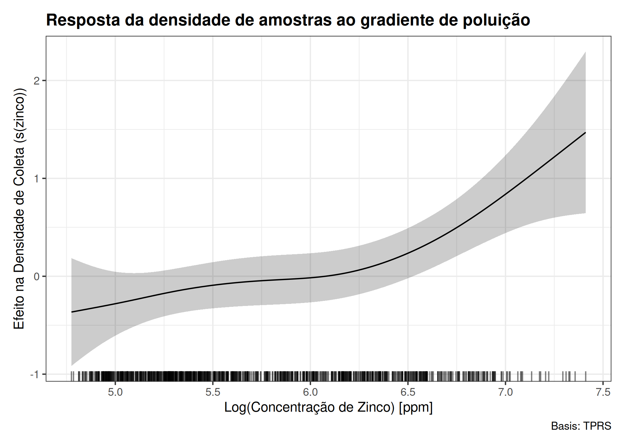 Envolvendo a curva de tendência, a faixa sombreada em cinza representa o intervalo de confiança de 95%, cuja variação de largura serve como um indicador visual da incerteza estatística do modelo; nota-se que essa faixa é estreita na região central do gráfico, denotando alta precisão, mas se expande significativamente na extremidade direita (valores acima de 7.0), refletindo a escassez de dados nessas condições extremas. Essa distribuição dos dados é confirmada pelas pequenas barras verticais pretas situadas na base da figura (rug plot), que aparecem densamente agrupadas nos valores intermediários de zinco, mas tornam-se esparsas nas concentrações mais elevadas, o que explica matematicamente o aumento da incerteza e confirma visualmente o viés intencional do desenho experimental voltado para as áreas de maior interesse ambiental.