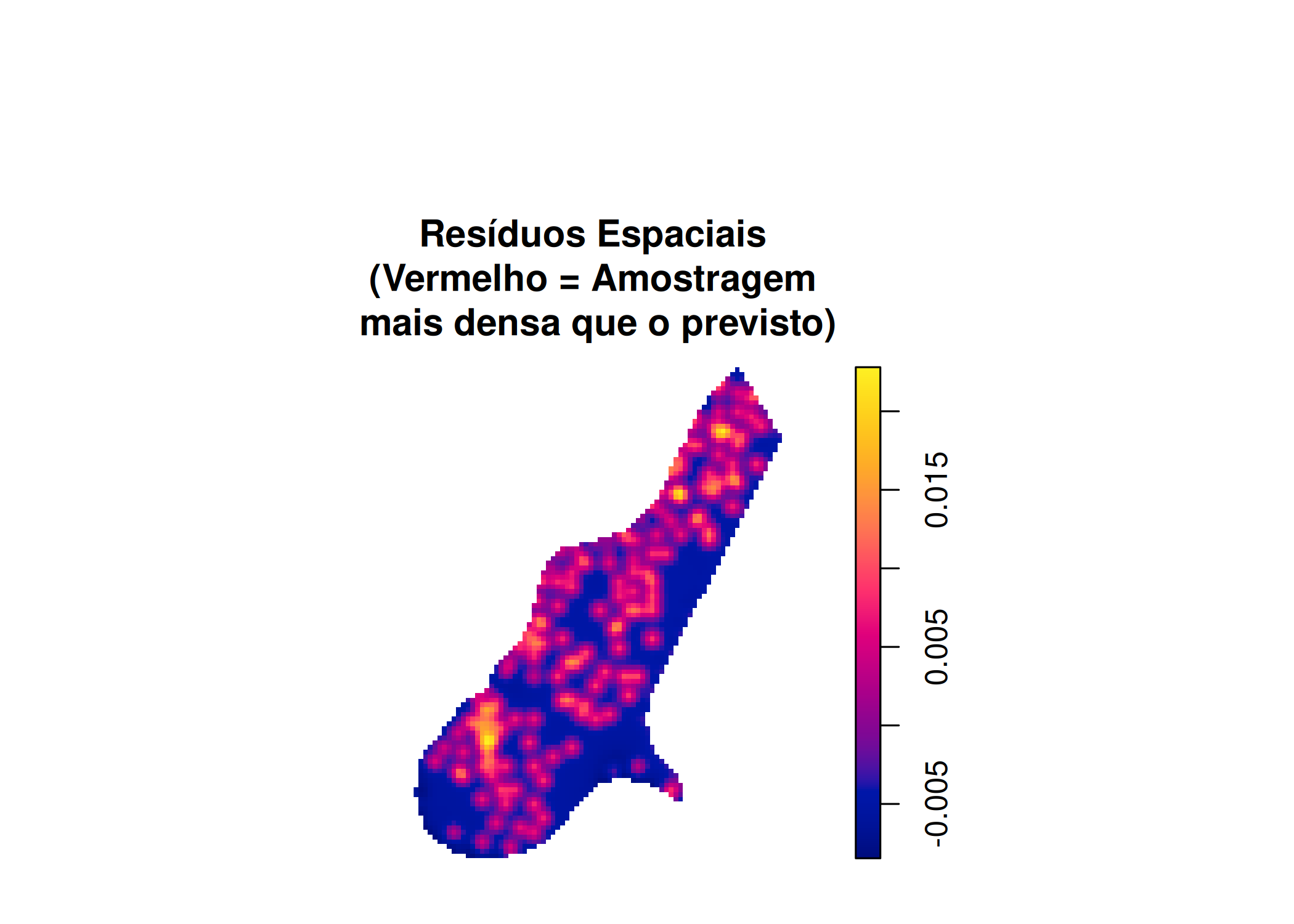 main = "Resíduos Espaciais \n(Vermelho = Amostragem \nmais densa que o previsto)")