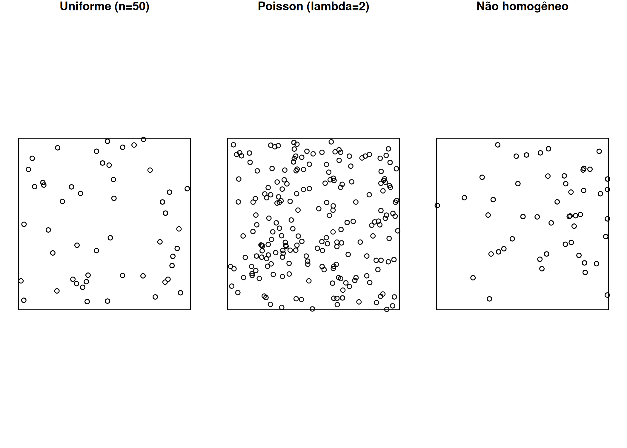 A distribuição Poisson é comumente empregada para modelar a ocorrência de eventos raros e independentes em uma área de estudo. Assim, um processo pontual que segue a distribuição Poisson descreve o número de eventos raros que ocorrem em uma determinada área de estudo, e sua distribuição de probabilidade é dada por,