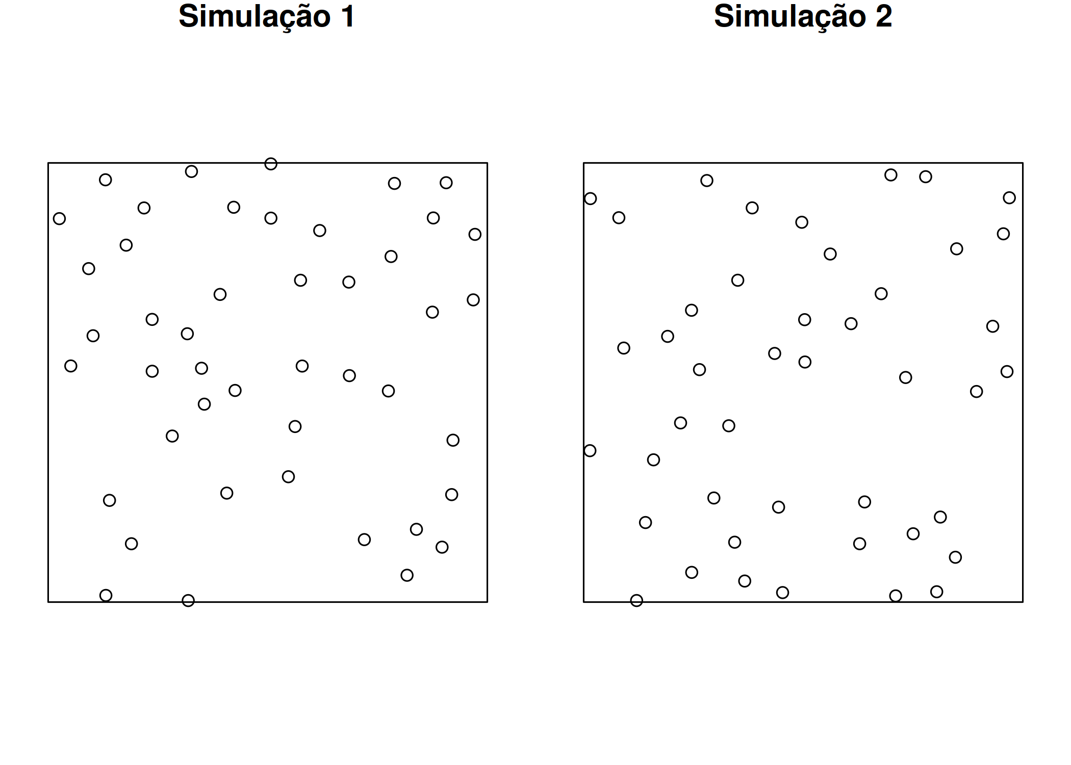 Um processo pontual é estacionário se a distribuição espacial dos eventos é invariante sob condição de translação (J. Illian et al. 2008; Adrian Baddeley, Rubak, e Turner 2015). Seja \(N=\{s_{1}, s_{2}, \ldots , s_{n}\}\) um processo pontual e \(N_{t} = \{s_{1} + t, s_{2}+t, \ldots , s_{n} +t\}\) a sua translação, este será estacionário se para qualquer \(t\in \mathbb{R}^{d}\), \(N\) e \(N_{t}\) apresentarem a mesma distribuição espacial dos eventos, ou seja,