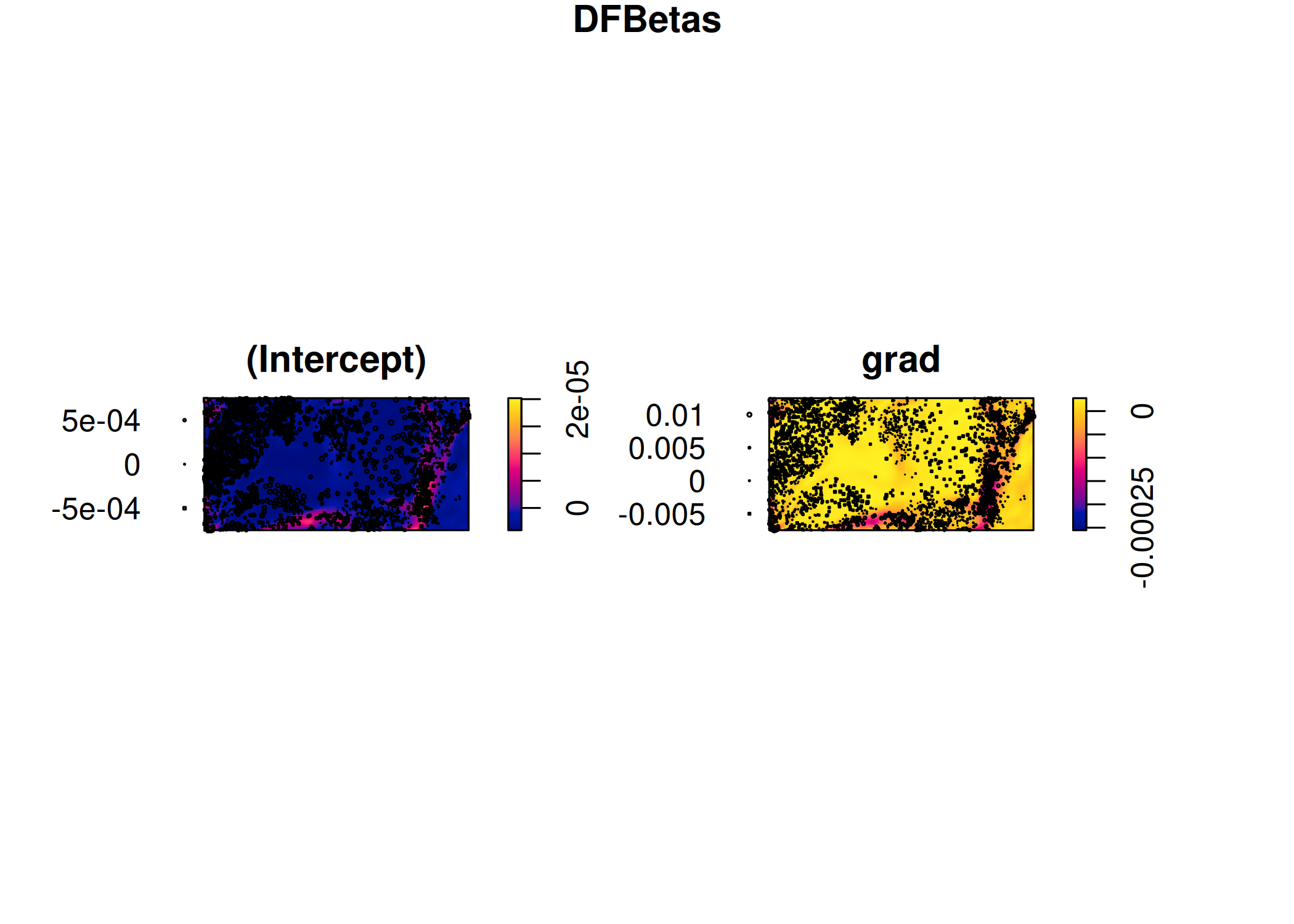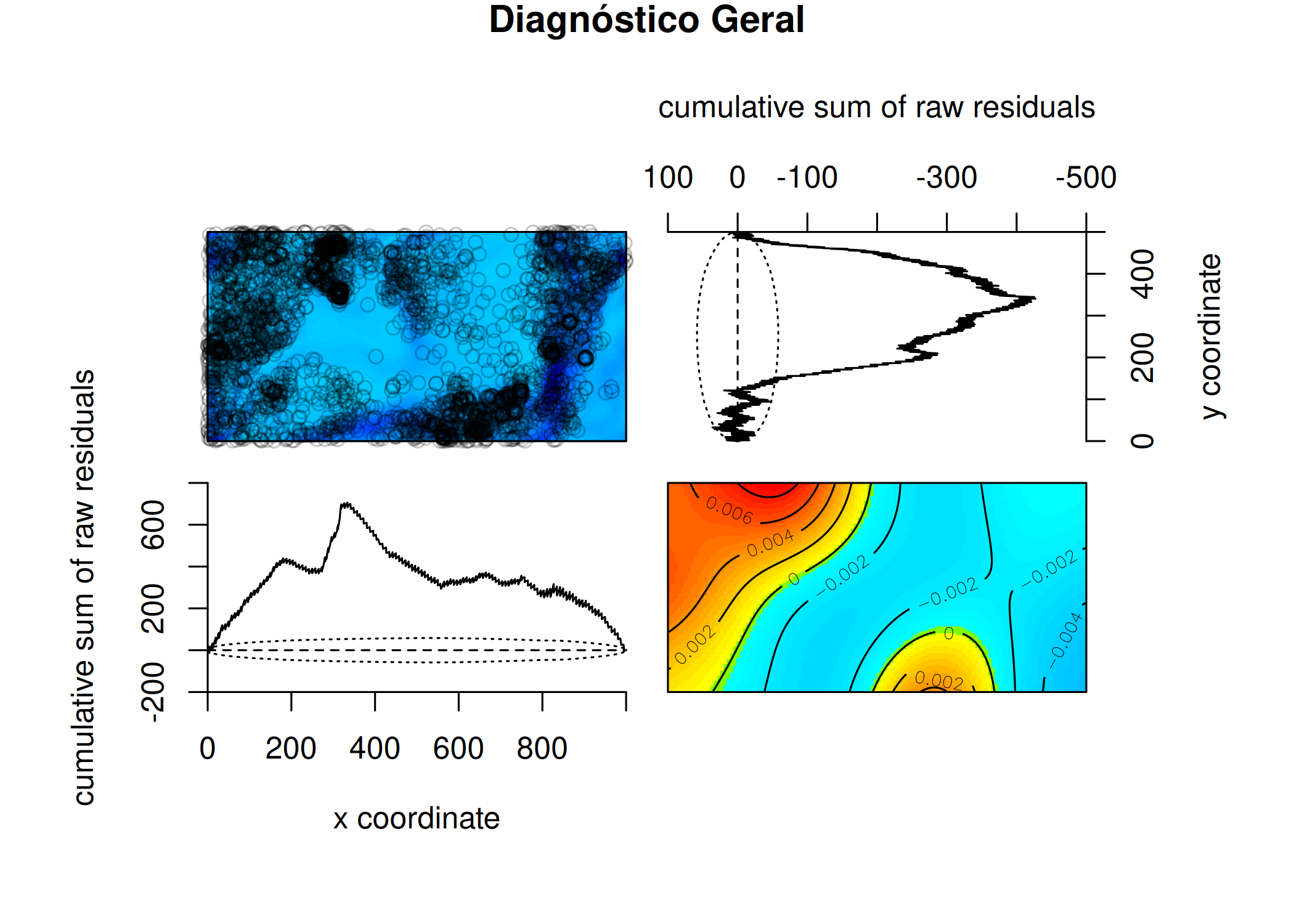 • gratia::draw(): Uma função moderna projetada especificamente para objetos gam. Ela produz diagnósticos visuais e gráficos de efeitos parciais (mostrando como a intensidade muda em função da covariável, mantendo o resto constante) prontos para publicação. Como o spatstat armazena o objeto do modelo ajustado internamente, a extração (fit\(internal\)glmfit) permite conectar esses dois mundos.